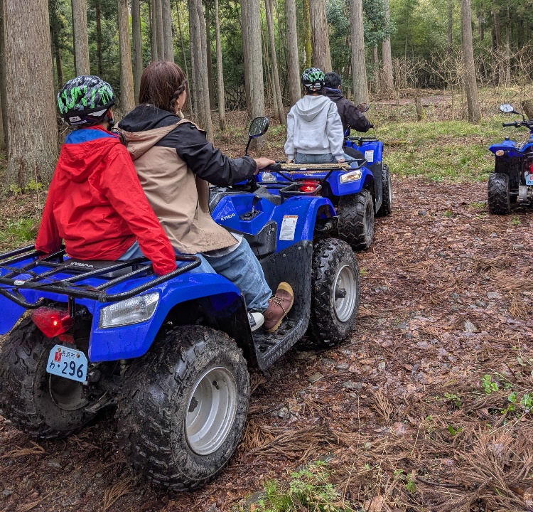| 利用料金 | 林道から森林コース 約20分 2,500円/人 林道から森林コース 約30分 3,500円/人 追加オプショナルツアー 約10分 1000円/台 普通免許要・一人乗り ・各コース終了後に追加オプションとしてお受けしております。 ・オプショナルツアーのみの運行はありません。 ・バギー係員の先導で絶景ポイントやワイルドポイントへ案内いたします。 ・記念写真を撮る時間がたっぷりあります。 ・申し込みは現地でお受けします。お客様、到着遅延の場合は不可の場合がございます。 |